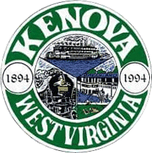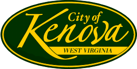 The logo is a dark green horizontal oval with a golden border. In the middle says "City of Kenova". A golden bar extends from the bottom of the K to the golden oval. Inside the bar is the text "WEST VIRGINIA" in dark green.