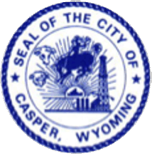 The city’s seal has additional elements not used on the flag’s seal: a rising sun and city outline, to symbolize the bright future of the growing city of Casper; plowed fields, suggesting the agriculture of the area; and a mountain, representing Casper Mountain. A rope design, also omitted on the flag, encircles the outer edge of the seal. The border on Wyoming’s state flag, although a different color, perhaps inspired the border on Casper’s flag.