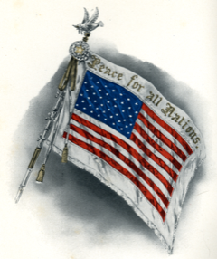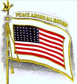 In effect, it is a national flag with a white border. Unofficially there were variants that added the phrase “Peace for all nations” on the top border in gold letters. Sometimes that phrase or a similar phrase was placed on a streamer that was attached to the pole above the flag. Above are illustrations from 1908 and 1913, respectively, of the US Peace Flag.