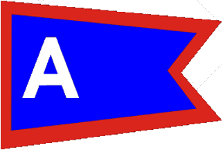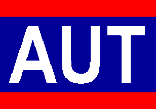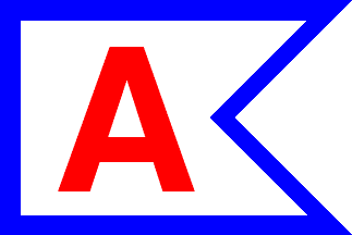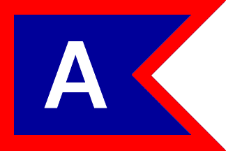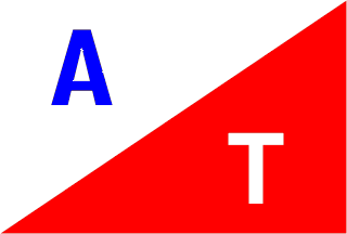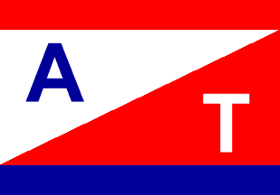No information except the flag: divided diagonally white over red, with red and blue upper and lower edges and the letters A in blue and T in white on the two halves of the field.
