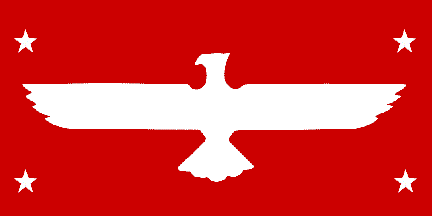 Asia. The flag, red with a white eagle and a white star in each corner, was