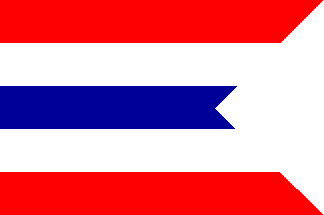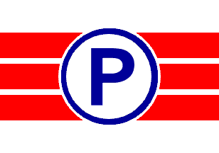 three red horizontal stripes surmounted by a blue bordered white circle bearing