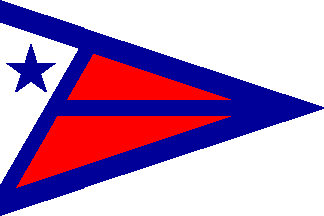 The burgee is a red triangle with a border along the flywise edges, and with a line under something like 30 degrees starting from the lower hoist corner dividing the field into two panels. The flyward panel divided in two by a flywise line