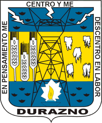 The coat of arms was adopted on 10 November 1953, being designed by the plastic artist Adolfo Pastor. It is a shield with a white border, reading the motto created by Carlos Scaffo: EN PENSAMIENTO ME CENTRO Y ME DESCENTRO EN LABOR [In Thought I Am Centered and I Distract Myself In Work]. At the bottom, DURAZNO is read. The inner section is composed of three horizontal bands of blue-yellow-blue, representing the Negro and Yí rivers. Over the yellow, three ears of wheat (left) are seen for agriculture; five pieces of fleece are seen to the right alluding to ranching (effort and wealth). A big electric tower alludes to the fact energy is a major industry in the area, especially in Rincón del Bonete and Baygorria. The tower emits rays to the top corners and top-center. At the bottom, a lamp shines for hope Durazno will continue progressing. What appear to be multiple small black lamps appear in each corner.