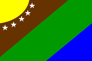 - a flag diagonally diagonally divided brown-green-blue with a yellow quarter-of-sun in canton, lined with five white stars.
