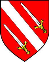 c) Gules a bend Argent between two swords in bend of the same