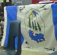 The flag of the Island Lake Tribal Council, Manitoba, is vertically divided in three stripes blue-white-blue, where the white stripe is wider then the others two. The council logo is positioned in the center of the white field and four traditional elements on the four corners of the same field.